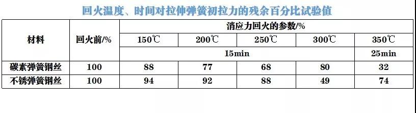 冷拔成形并經過強化處理的材料,在冷狀態下加工成彈簧,或者時效處理后又經過變形加工的彈簧性元件,都應該進行消應力回火處理。處理的規范是按材料的種類和規格決定,達到既要消除加工應力,又要保證材料的強度、硬度和韌性等。(見下圖):